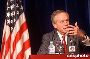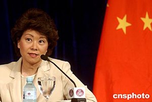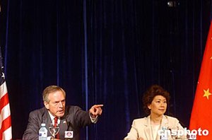 六月二十四日,美国商务部长埃文斯和劳工部长赵小兰在北京举行联合记者会,就中美贸易等有关问题答记者问。中新社记者:武仲林