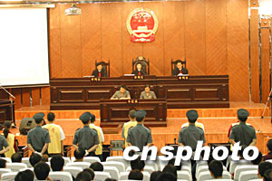 “一二·二三”特大井喷事故案七月十四日上午九时三十分在重庆市第二中级人民法院开庭审理。图审判现场。作者:邹辉