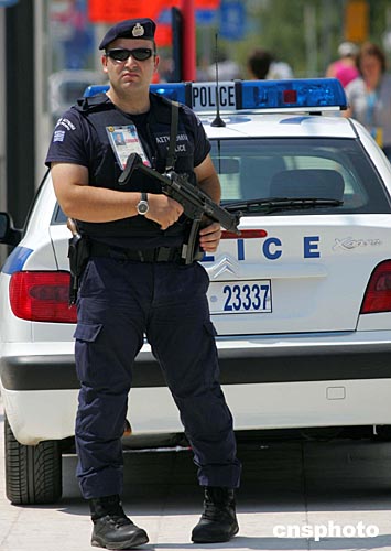 雅典奥运会开幕在即,一名警察手持冲锋枪在奥运新闻中心外执勤。雅典奥运会在安全保卫方面的投入高达十多亿欧元。中新社记者:张炜
