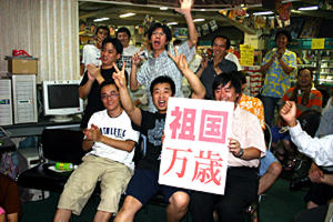 这次活动是由大阪的中文报纸《关西华文时报》策划组织的,地点在市中心的中华城,数十名中国人球迷在鲜艳的五星红旗下,高举“祖国万岁”的标语牌,边观看大屏幕电视,边为中国队呐喊助威的。日本有名的电视台每日电视台专门派出了一个摄制小组进行现场采访。