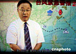 中国气象局局长秦大河八月十二日在中央电视台黄金时间的天气预报节目上首次亮相,发布中国大部分地区即将出现台风和暴雨的紧急警报,同时显示红色的中国地质灾害警报。中新社记者:贾国荣