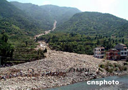 图为泥石流就是沿着山上那条长长的新裸露的沟壑下来的。作者:周海文