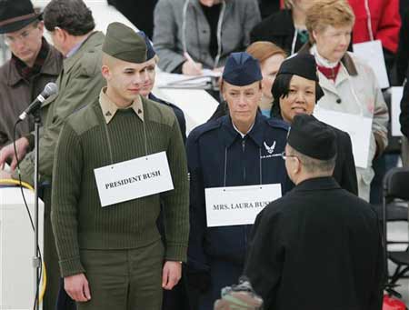 两名年轻的美军战士分别挂着写有“总统布什”和“第一夫人劳拉”的牌子,在预演中扮演总统夫妇。