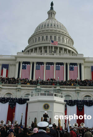在美国军乐队的《鼓号齐鸣》和《向统帅致敬》吹奏乐后,中午十二点整,布什在防弹玻璃围成的讲台上发表就职演说。出人意料的是,布什并没有谈到治国方略,更没有提及外交政策,甚至连天天在美国媒体上连篇累牍的伊拉克问题也没有说起。