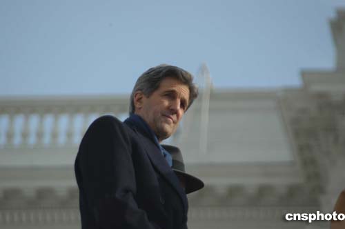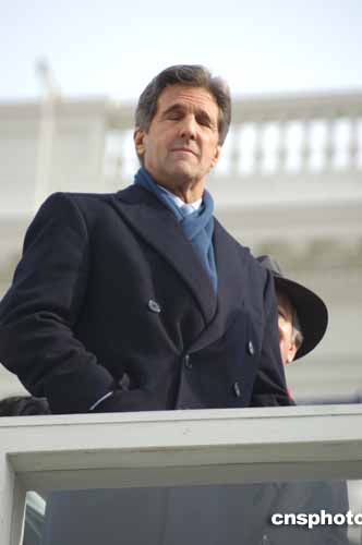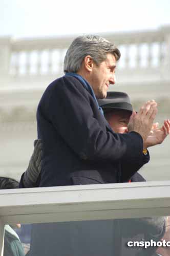 在去年底美国大选中败给布什的民主党参议员克里20日参加了布什就职典礼,坐在布什演讲台左侧的第七排。在整个仪式过程中,克里表情严肃,神情落寞。当布什宣誓完毕,全场欢呼时,克里有礼貌地鼓掌,他身旁的另一位嘉宾拍拍他的后背,似在安慰克里。作者:余东晖