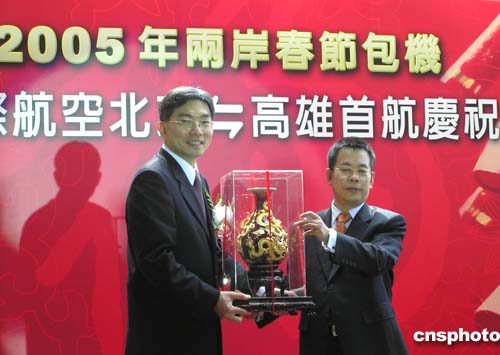 中国国际航空公司总裁马须伦在欢迎仪式上向台湾长荣航空公司的代表敬赠礼品。作者:陈立宇