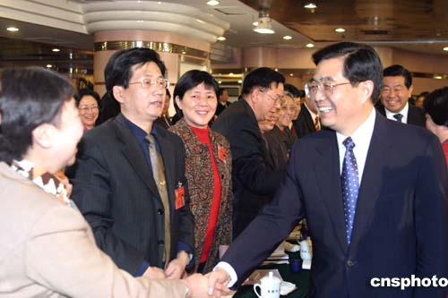 国家主席胡锦涛三月四日到全国政协民革、台盟、台联组驻地看望委员,参加联组讨论并听取意见和建议。全国政协主席贾庆林一同参加了看望和讨论。作者:李鹏