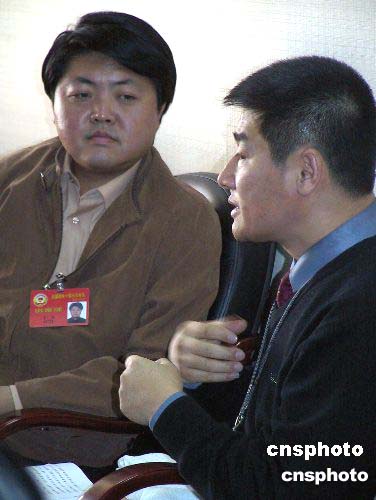 三月五日,全国政协社科界委员在北京讨论政府工作报告。两会会务组特别给聋哑残疾委员配备“手语翻译”,让这些“特殊”代表委员也能深刻了解“两会”精神。图为一名手语师(右)在给一名聋哑委员(左)现场翻译。作者:王辛莉