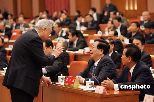 十届全国人大三次会议主席团第三次会议三月十日在北京人民大会堂举行,出席会议的曾庆红、吴官正与盛华仁(左)一起交谈。作者:毛建军