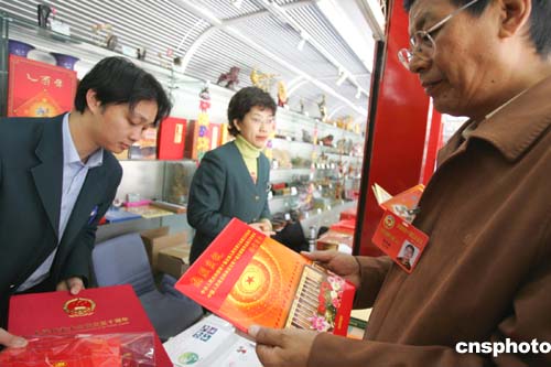 全国政协十届三次会议十一日休会半天,一位政协委员在驻地宾馆选购“两会”首日封及各类纪念邮票。作者:汤彦俊