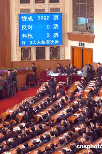 十届全国人大三次会议三月十四日上午在北京人民大会堂举行闭幕大会,会上审议并高票通过《反分裂国家法》。作者:陈文