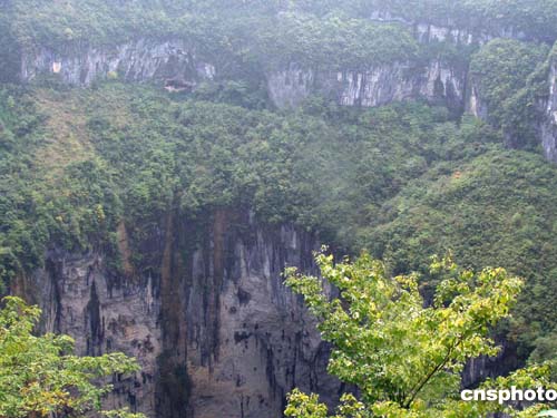 3月16日拍摄的奉节小寨天坑将申报有望成为世界自然遗产。小寨天坑坑口直径622米,坑底直径522米,深666.2米,天坑中有阴河,水流量每秒8.77立方米,比美国阿里西波漏斗还大,是目前世界上发现的最大漏斗。