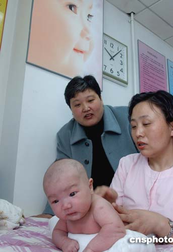 四月七日是世界卫生日,今年的主题是“珍爱每一位母亲和儿童”。世界卫生组织提供的最新数据显示,在发展中国家,怀孕和分娩是育龄妇女最主要的死因之一。专家指出,我国的高龄产妇越来越多,高龄分娩将使她们面临更多的危险。图为在北京妇产医院宝宝健康乐园,护士为宝宝做“运动操”。作者:韩艺冰