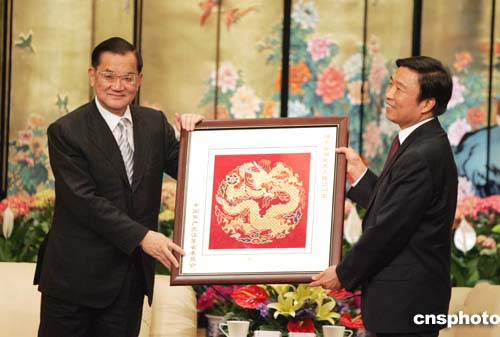 会见时,中共江苏省委向访问团赠送了过去专为皇家制造、现成为南京艺术象征的丝织工艺品“金丝团龙”,李源潮说,龙是中华民族的象征。连战主席也回赠了一件台湾名家制作的工艺品三羊开泰瓷瓶。连战说,以此祝愿江苏发展、兴旺。