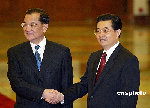 中共中央总书记胡锦涛今日下午在人民大会堂会见连战率领的中国国民党大陆访问团一行,并致欢迎词。连战在胡锦涛致辞后也发表了答谢辞。