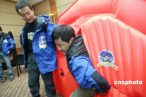 四月二十一日,由北京三夫户外运动俱乐部发起并成立、联想集团公司冠名赞助的一支民间科学考察队伍-联想锋行科学考察探险队在北京正式成立,将于今年五月份对可可西里(藏北、新疆阿尔金山区域)进行由南至北的穿越式科学考察活动,最重要的科考内容是与北京大学环境学院联合进行的“青藏高原可可西里地区表土POPs分布调查”项目,这项科考内容在中国还是第一次。本次科考探险活动将从五月一日开始,历时二十二天,行程六千多公里,其中穿越无人区达一千六百多公里。图为科考探险队队员演示一个酷似帐篷的便携式高压氧舱。作者:盛佳鹏