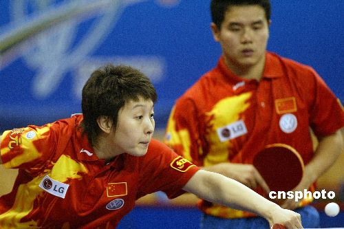 五月二日,在上海体育馆举行的第四十八届世界乒乓球锦标赛进入第三天,混双大战全面打响,中国选手刘国正、白杨在比赛中轻松晋级。图为刘国正、白杨在比赛中。作者:盛佳鹏