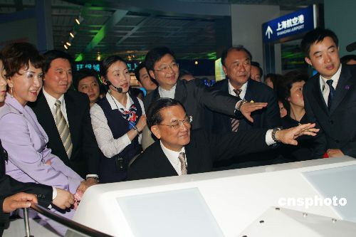 五月二日,连战在上海畅开“电子模拟游艇”,游览上海深水港,因其技术高超,引起大家喝彩。这是连战一行参观上海城市规划馆中的情景之一。作者:潘索菲
