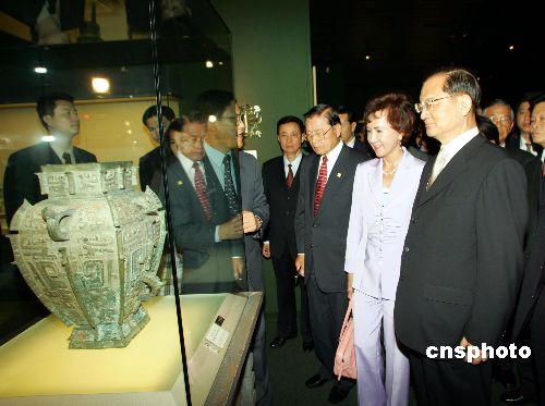 连战一行在上海博物馆参观,连战夫妇对该馆陈列的青铜器饶有兴趣。作者:潘索菲
