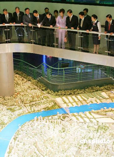 连战一行在上海参观城市规划馆,观看未来上海的城市模型。作者:潘索菲