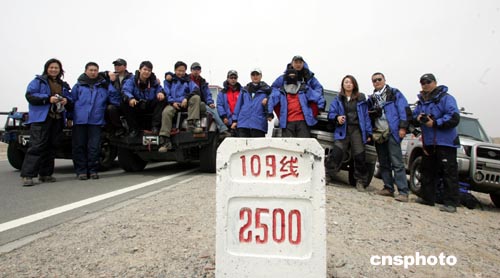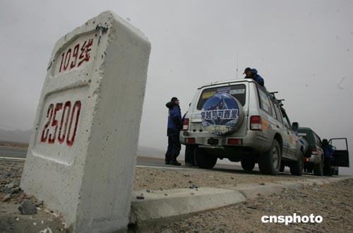 中新网5月3日电 二零零五年五月三日,穿越可可西里联想锋行探险队车队抵达北京——拉萨的109国道2500公里处。