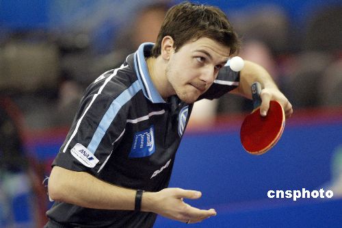 第四十八届世界乒乓球锦标赛男子单打第三轮比赛五月三日晚在上海体育场进行,德国选手波尔淘汰了瑞典老将佩尔森拿到了十六强的一张门票。(新社记者:盛佳鹏)