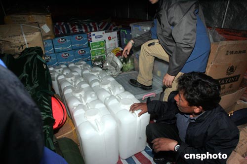 二零零五年五月五日,穿越可可西里联想锋行探险队车队抵达拉萨,进行休整,为挺进可可西里作最后的准备。下图为队员把大桶盛装饮用水入车装入八吨重的大卡车。