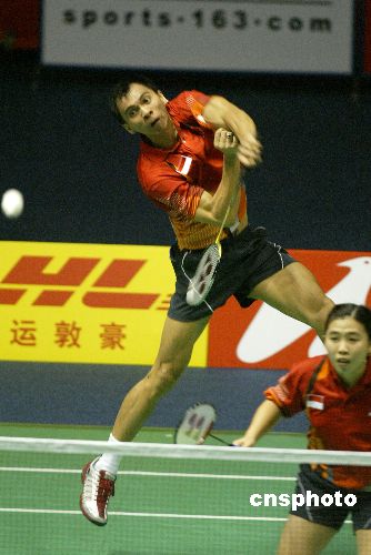 五月十二日,在北京首都体育馆进行的第九届苏迪曼杯世界羽毛球混合团体锦标赛大战进入了第三天,中国队与印度尼西亚队交锋,在首场的混合双打的比赛中,印度尼西亚组合林培雷、尤·泰蒂一比二不敌中国组合张军、高崚。