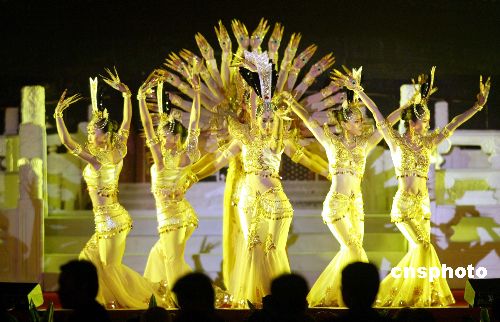 五月十六日晚,二○○五北京《财富》全球论坛在北京人民大会堂开幕,由聋哑人表演的舞蹈“千手观音”赢得现场掌声不断。作者:廖文静
