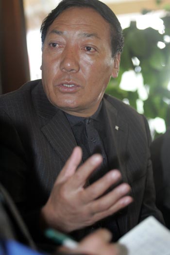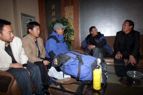 穿越可可西里联想锋行探险队向可可西里国家级自然保护区管理局捐赠两台联想电脑。图为可可西里国家级自然保护区管理局局长才嘎在西宁小天鹅宾馆探望此间下榻的探险队员。
