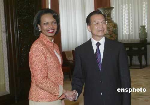 七月十日,中国国务院总理温家宝在北京中南海会见来访的美国国务卿赖斯。作者:史利