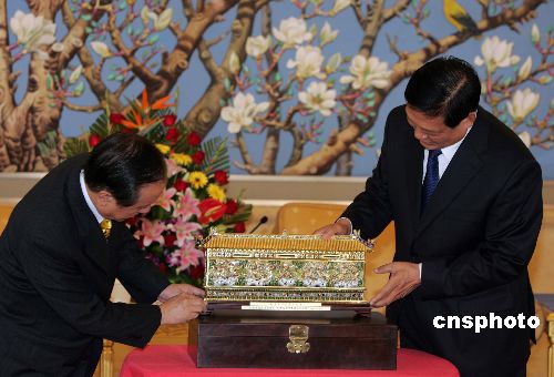 随后,宾主互赠礼物表心意。刘淇向郁慕明赠送了金丝镶嵌景泰蓝九龙壁。郁慕明回赠了名为“华堂集锦”的台湾特色交趾陶,并祝愿中华精神能在古都北京,在这个如花的世界里得以传承光大。