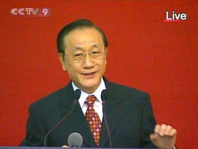 7月12日新党主席郁慕明在中国人民大学逸夫会议中心演讲。(央视截图)