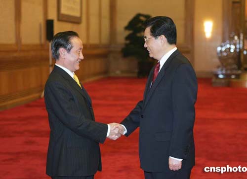 中共中央总书记胡锦涛7月12日在北京人民大会堂会见了台湾新党主席郁慕明率领的台湾新党“民族之旅”访问团。作者:毛建军