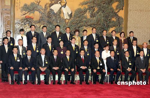 中共中央总书记胡锦涛七月十二日在北京人民大会堂会见台湾新党主席郁慕明率领的台湾新党“民族之旅”访问团时,与代表团一起合影。作者:毛建军