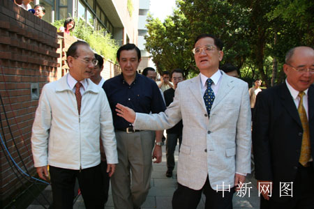 7月16日,中国国民党主席选举在全台601个投票所展开。现任国民党主席在居家附近的台北复兴中小学参加投票。图为连战(右二)在步入学校前,与国民党秘书长林丰正(左一)交谈台湾农产品登陆问题,1号参选人、台北市长马英九(中)和国民党副主席吴伯雄(右一)陪同。中新社记者 董会峰