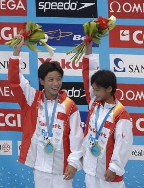 正是这两个不起眼的中国女孩今天在世界游泳锦标赛上一鸣惊人,将本届大赛的首枚金牌--女子双人十米台金牌收归中国队账下。贾童、袁培琳这两个陌生的名字让一位现场播发消息的外国记者颇费了一番周折。