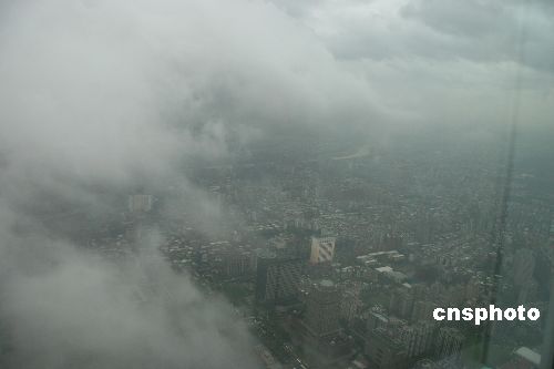 七月十九日,强台风“海棠”的中心离开台岛,台北市依然雨势不停。图为在台北101大楼八十九层观景台(三百八十米高)拍摄到的台北市容,阴云依旧笼罩台北,能见度甚低。作者:董会峰
