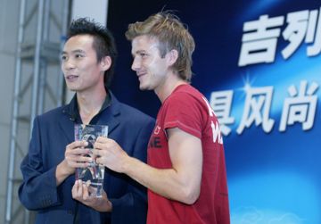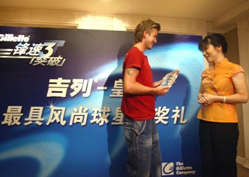 7月22日上午,刚刚获得“皇马最具风尚球星”称号的“万人迷”贝克汉姆出席了此次皇马中国行的官方赞助商、同时也是这位巨星为之代言的吉列公司在昆仑饭店举办的球迷活动——吉列-皇马最具风尚球迷颁奖礼。