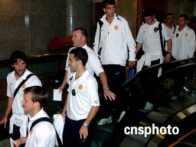 英超豪门曼联队昨日抵达北京,开始他们的中国之行。在未来的几天中,他们将与中国的球迷以及媒体见面,并将与北京现代队进行一场友谊赛。图为曼联球星抵达北京,兴致勃勃。
