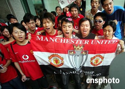 英超豪门曼联队昨日抵达北京,开始他们的中国之行。在未来的几天中,他们将与中国的球迷以及媒体见面,并将与北京现代队进行一场友谊赛。图为曼联球星抵达北京后,中国球迷热烈欢迎。