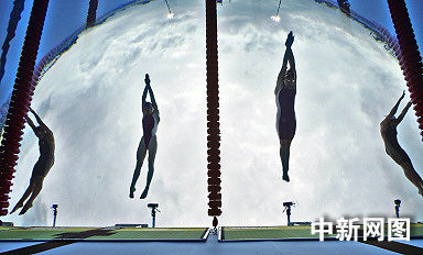 图为参加世界游泳锦标赛女子1500米自由泳决赛选手们在比赛开始时的瞬间照片。
