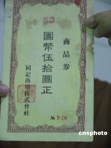 湖南省收藏协会理事阚志雄先生8月8日向记者展示了其收藏多年的“同记商场株式会社”商品券。该商品券反面左下角贴有一张橘红色、面值五分的印花,上面写着“满洲帝国收入印纸”。这成为当年日本扶持伪政府、对华经济侵略的又一铁证。作者:刘双双