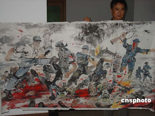 为纪念抗战胜利六十周年,常德老画家杨格正专心绘制其长幅画卷《血战常德》。整幅画卷分为战争、救死扶伤、悼念三大部分,再现了当年常德会战的情景。目前,两幅长两米、高一米,描绘战争场面的画幅已经完成。作者:邓霞
