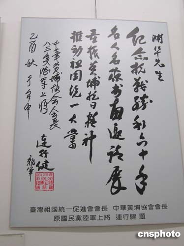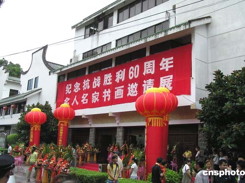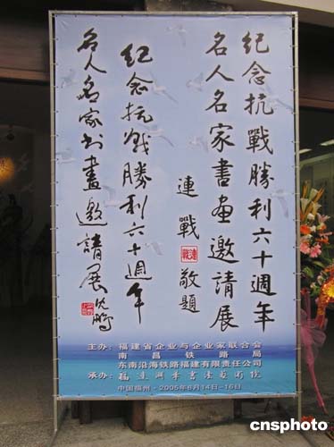 中新网8月14日电 为纪念抗战胜利60周年,弘扬中华儿女爱国主义和革命英雄主义精神,推动祖国和平统一大业,由中国新闻社福建分社、中国华艺广播公司和福建渊华书法艺术院等单位发起,福建省企业与企业家联合会、南昌铁路局、东南沿海铁路福建有限责任公司联合主办的《纪念抗战胜利60周年名人名家书画邀请展》今天上午在福州画院隆重开展。