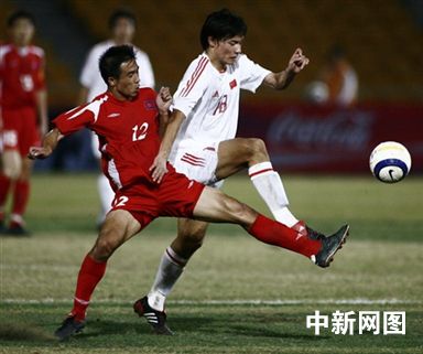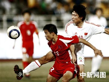 11月6日,中国男子足球队1比0战胜朝鲜队,获得第四届东亚运动会足球金牌。图为双方在地上激烈拼抢。