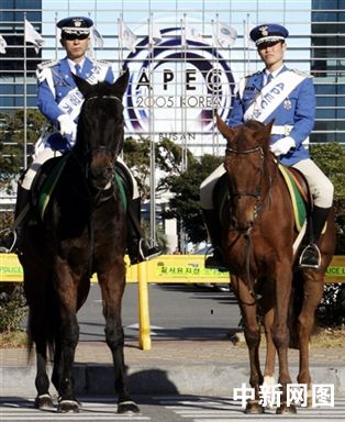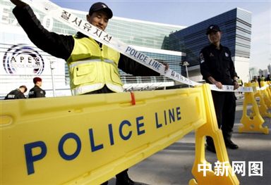 21个APEC成员体领导人或代表出席的釜山APEC峰会第一场会议将于18日下午2时(当地时间)在釜山会展中心2楼大会议室正式开幕。图为17日韩国警方加强保卫工作。