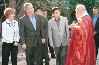 中新网11月18日电 据韩国《东亚日报》报道,美国总统布什及第一夫人劳拉访问韩国期间,在韩国总统卢武铉的陪同下拜访了庆州有名的佛国寺,图为佛国寺主持宗相法师迎接他们的到来。当听到世界上最古老的佛经就发现于佛国寺的石伽塔里时,布什表现出了极大的兴趣。(章田)
