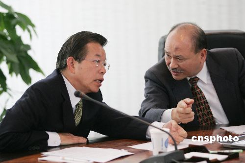 台湾“行政院长”谢长廷(左)二十六日到“交通部民航局”了解二零零六年春节包机的安排情况。据介绍,新的包机时间自一月二十日起至二月十三日止,两岸飞机班次和飞包机的机场数量都比二零零五年有所增加。作者:宗金柱