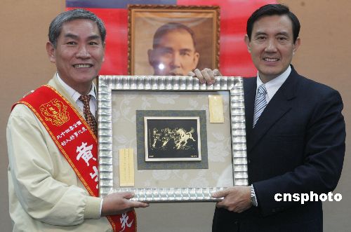 中国国民党主席、台北市长马英九十二月十二日在台北会见全台好人好事“八德奖”获奖代表时,一位代表赠送他一幅“九马图”,祝其前程远大。作者:宗金柱